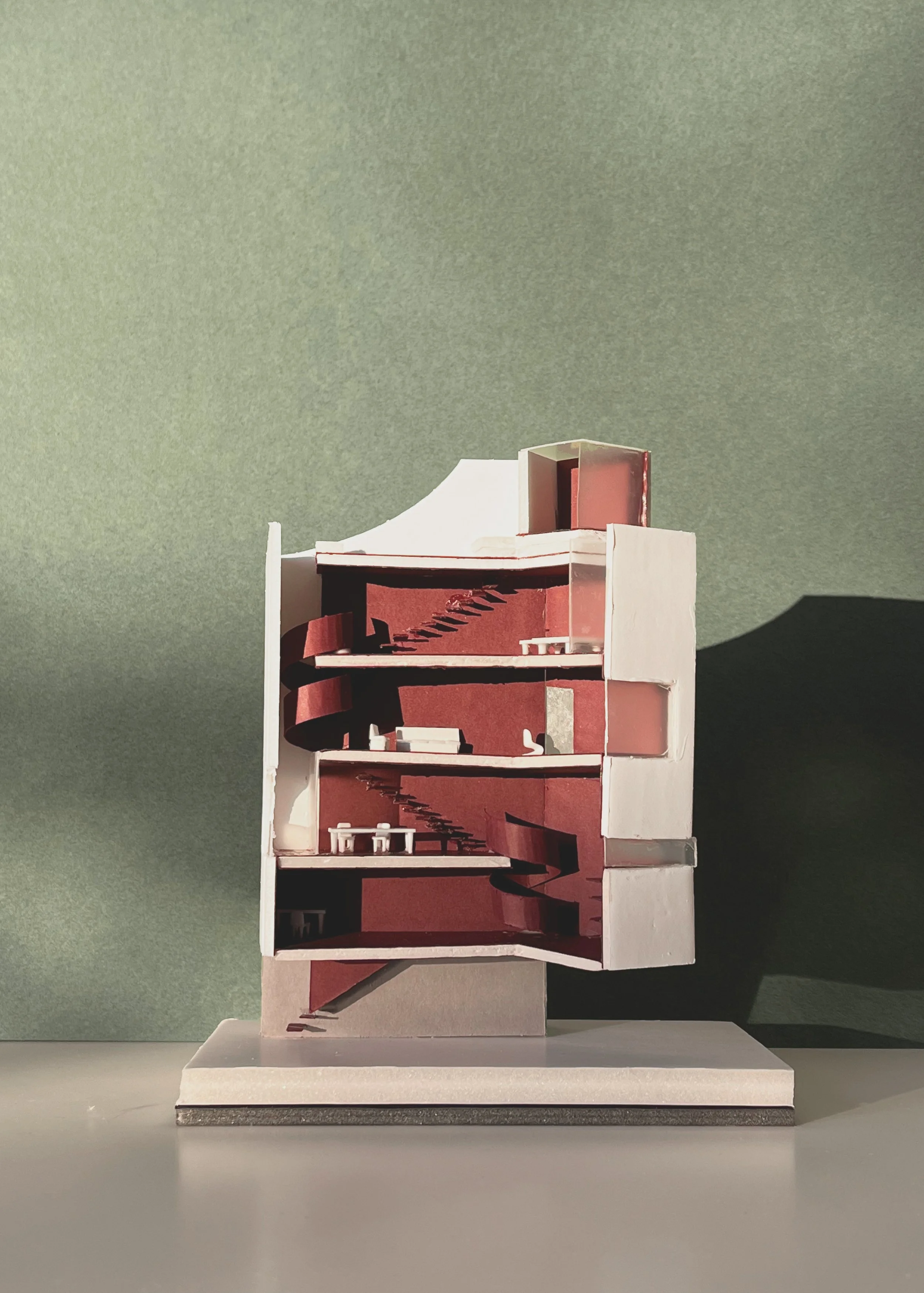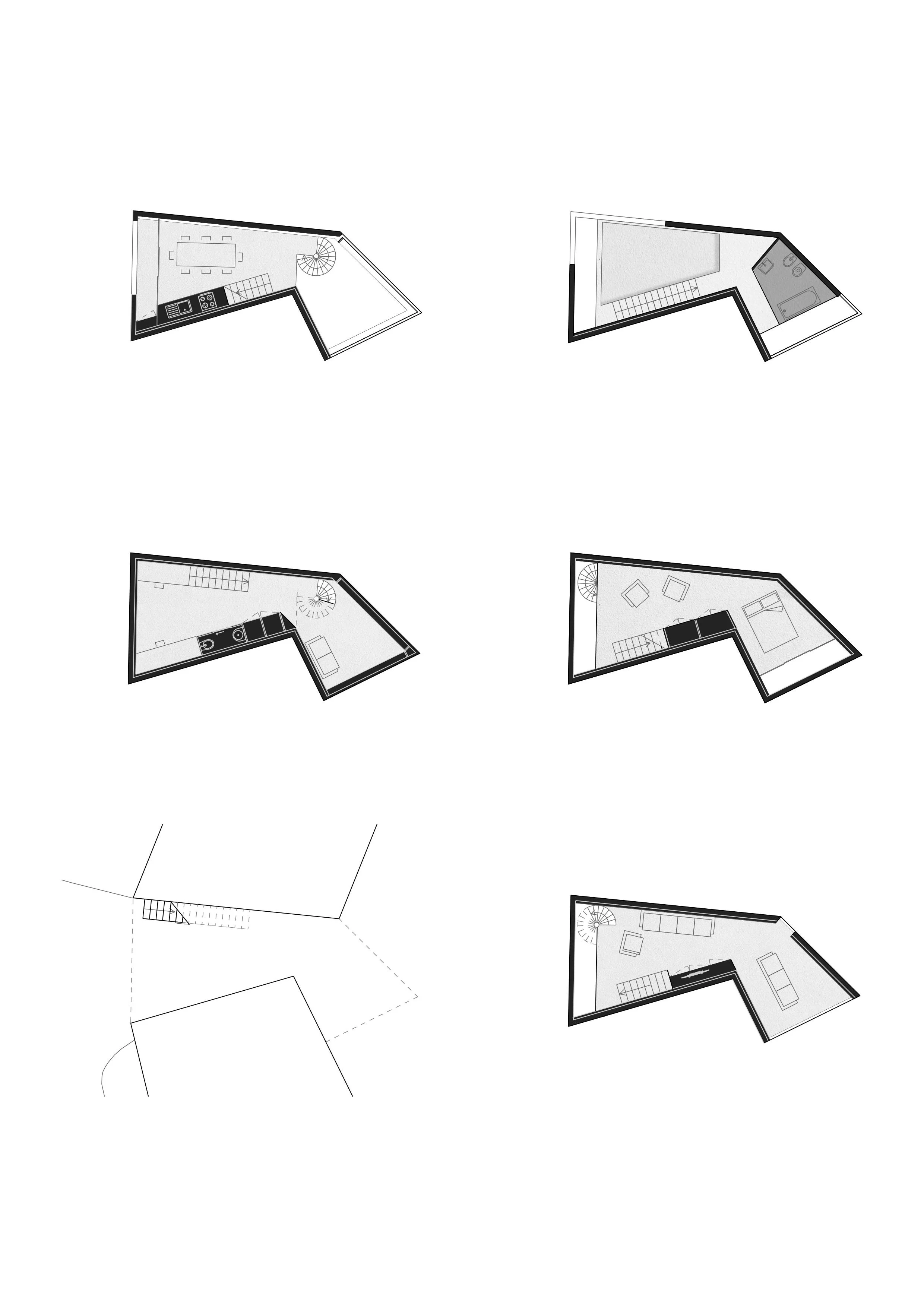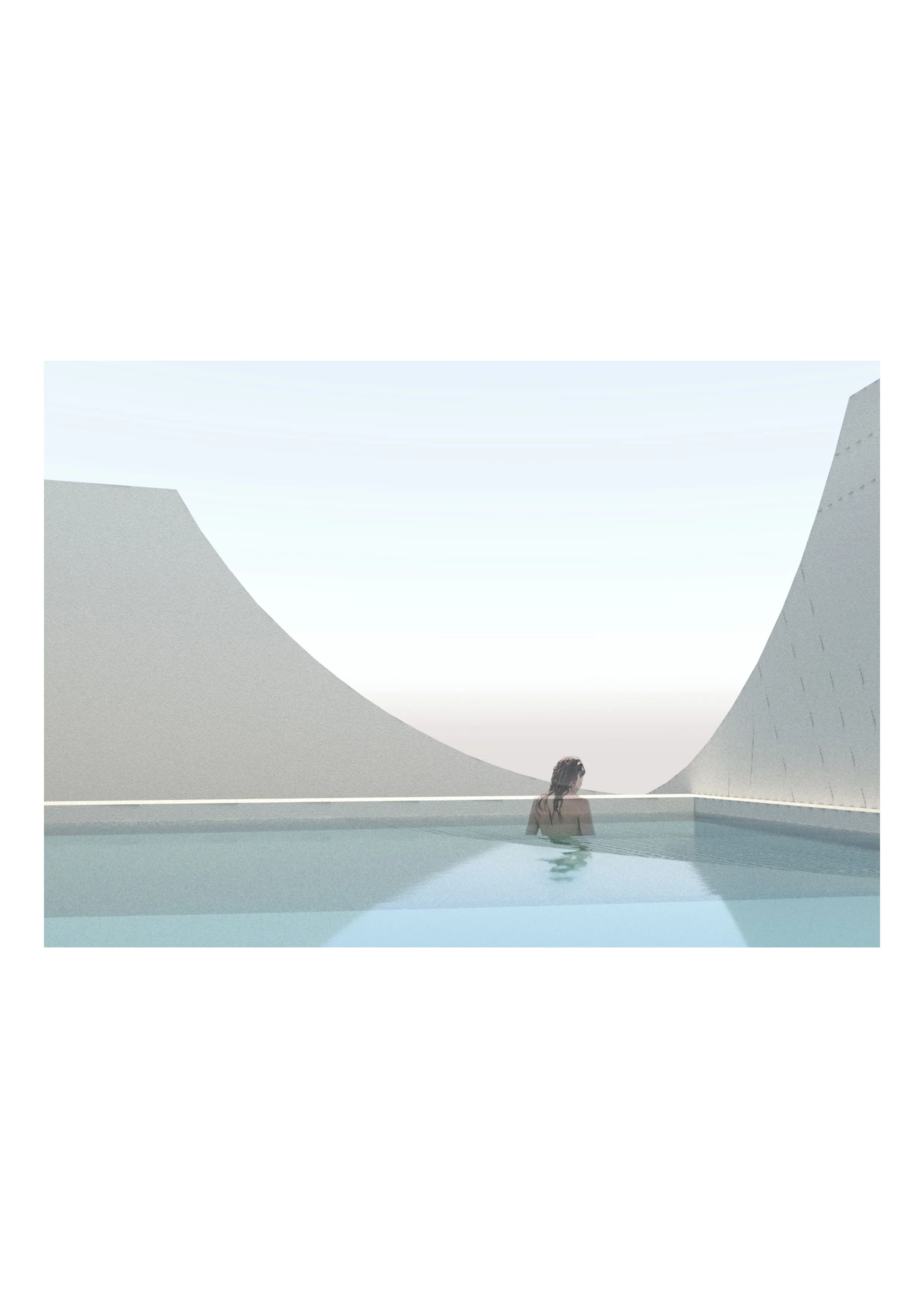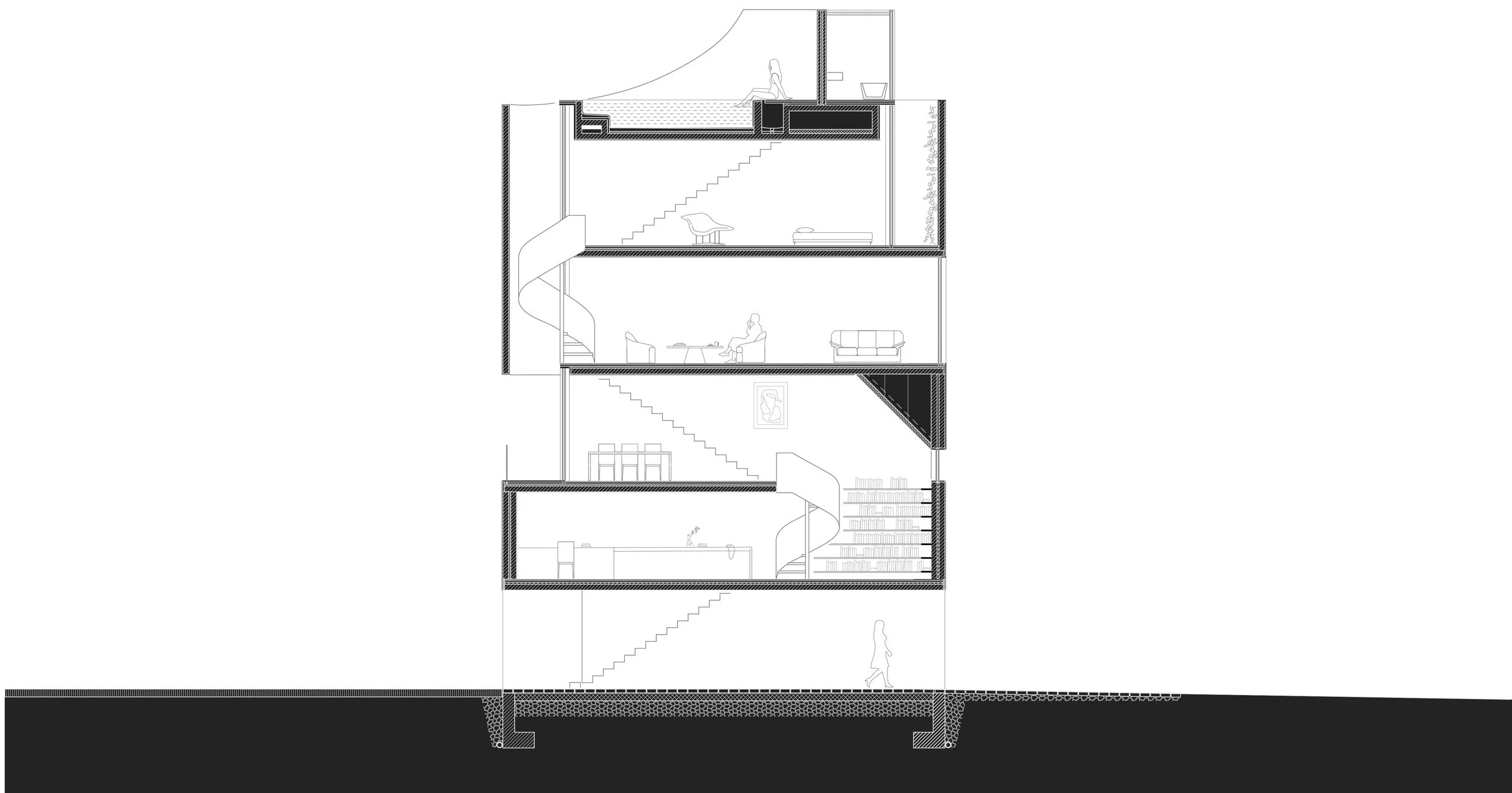 The spatial layout is vertically arranged, connected by two distinct staircases, the spiral stairs and the straight stairs. The pool on the upper level, with a high difference wall, forms a scenic frame offering a captivating panorama of the city.